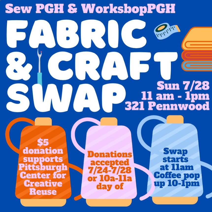 Fabric & Craft Swap at WorkshopPGH Sunday, July 28, 2024 12:00 PM 2:00 PM Google Calendar ICS WorkshopPGH, 11AM-1PM at 321 Pennwood Ave.Sew PGH & WorkshopPGH partnering with Pittsburgh Center for Creative Reuse. Donations accepted 7/24-7/27 and 7/28, 10AM-11AM. Please read WorkshopPGH’s post for details.